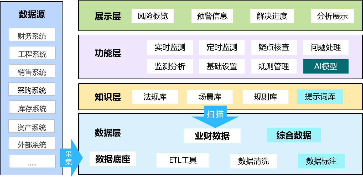 智能风险监测平台以“数据驱动风控,智能赋能管理”为核心,通过整合企业业财数据及内外部综合信息构建统一数据底座,梳理政策法规、风险场景等形成风控智库,依托实时监测、定时扫描与AI识别实现全周期风险预警,结合多维度可视化分析,为企业风险管理优化与管理水平提升提供数据支撑,破解传统风控痛点。